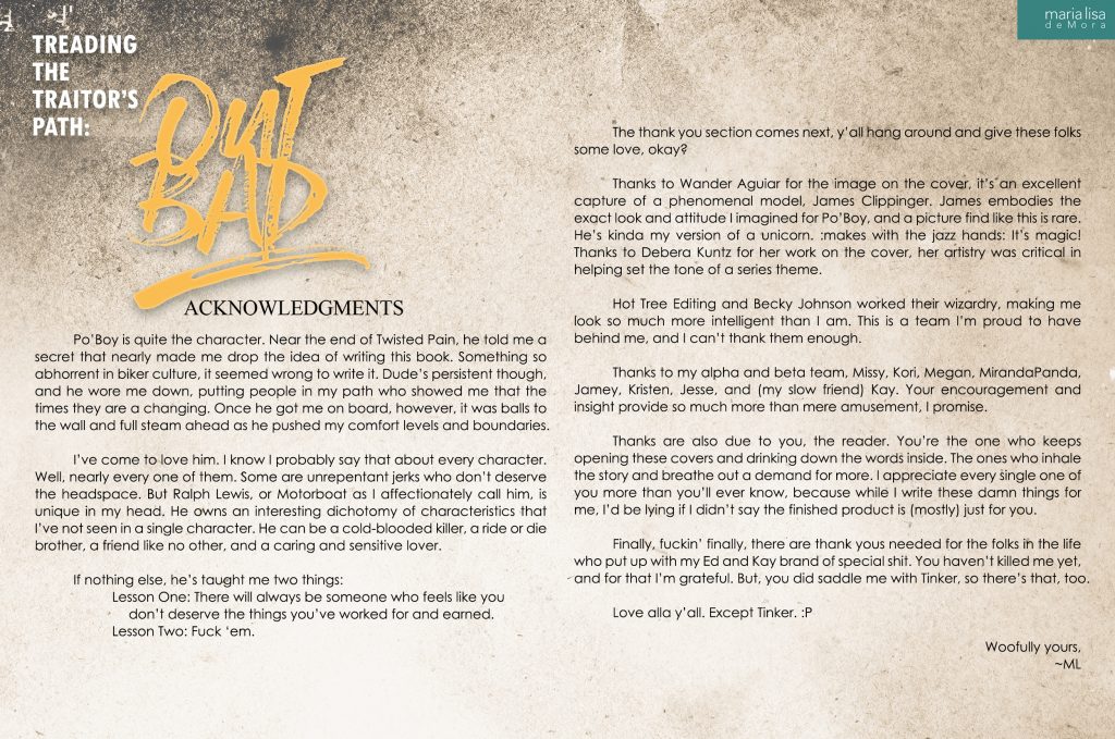 Thanks are also due to you, the reader. You’re the one who keeps opening these covers and drinking down the words inside. The ones who inhale the story and breathe out a demand for more. I appreciate every single one of you more than you’ll ever know, because while I write these damn things for me, I’d be lying if I didn’t say the finished product is (mostly) just for you.